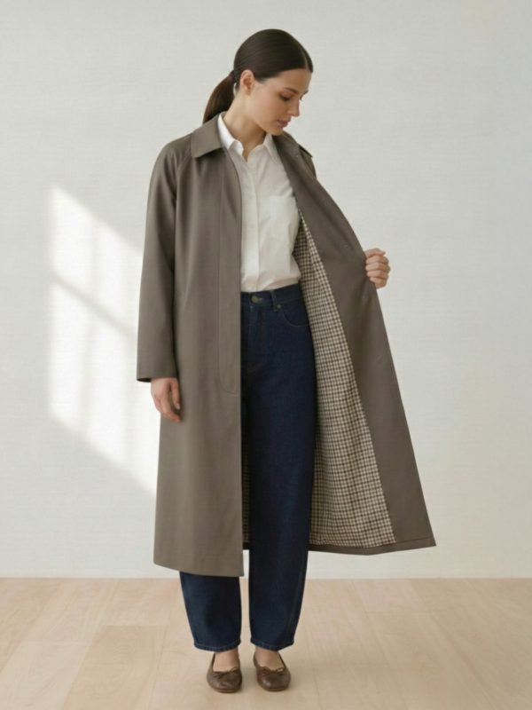 Kit para confeccionar esta gabardina minimalista y moderna de ajuste relajado inspirada en las gabardinas clásicas inglesas con: